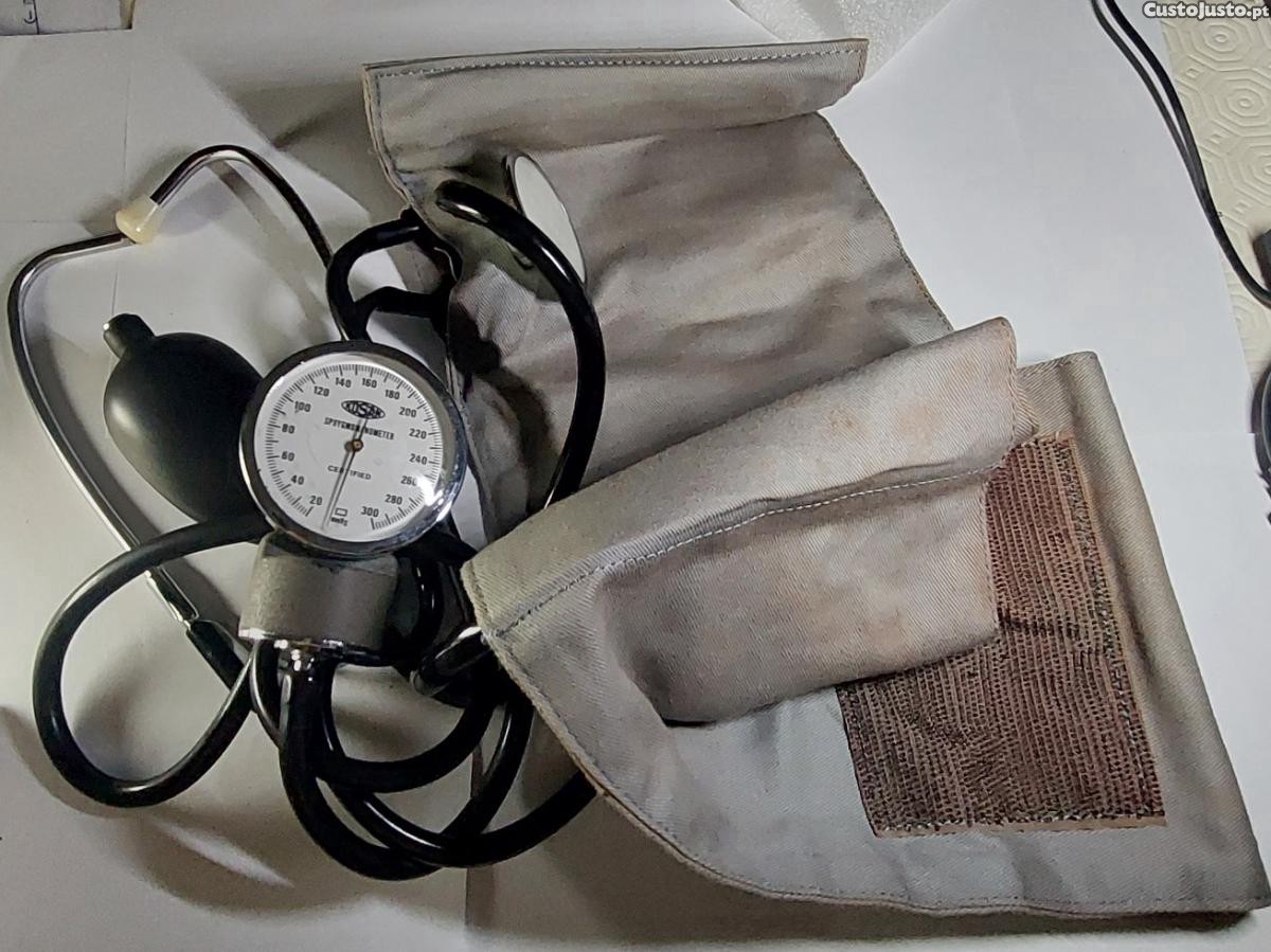 Medidor de tensão arterial e estetoscópio antigo, a funcionar bem, interessante para