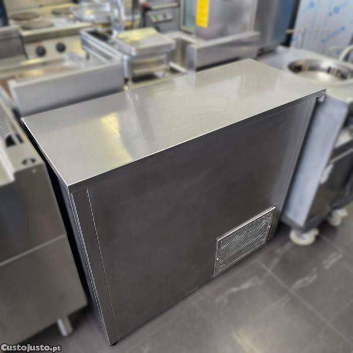 A2392 - Bancada alta em inox com espaço interior sem prateleiras, frente fechada com grelha. Com 1 lateral fechado.