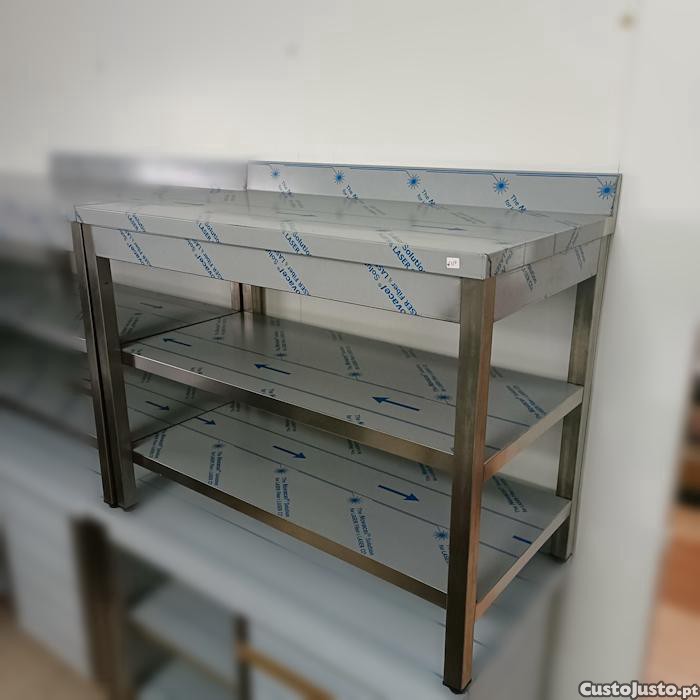 N318- Bancada em inox com 2 prateleiras, alçado 40cm aba esmagada.