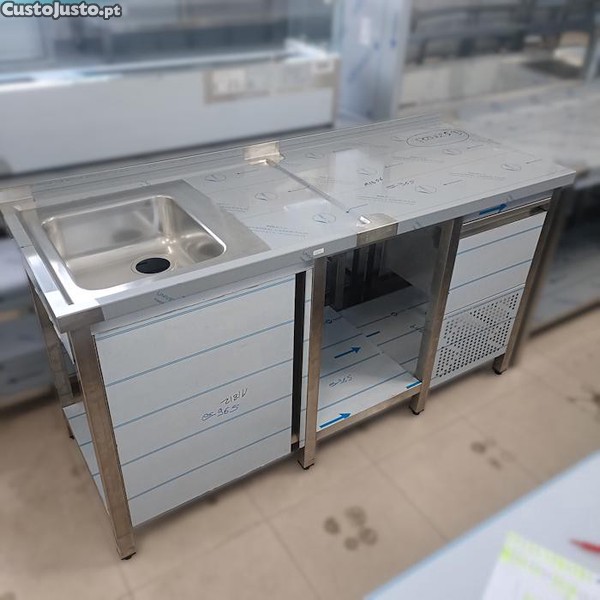 N259- Bancada em inox com cuba 34x40x16cm. Com porta batente, tulha de borras e espaço para máquina de lavar de chávenas.