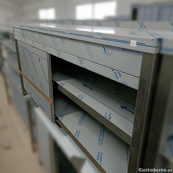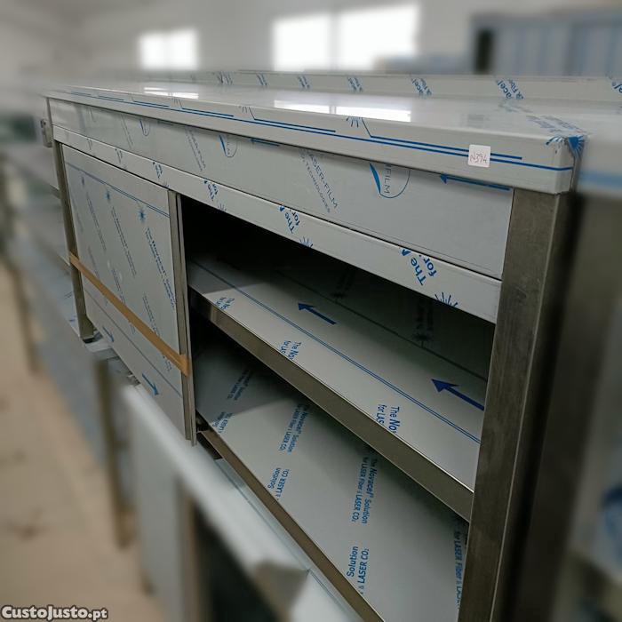 N394- Bancada em inox toda fechada com 2 prateleiras. Com portas de correr, alçado 40cm aba esmagada. Laterais e costas fechadas.