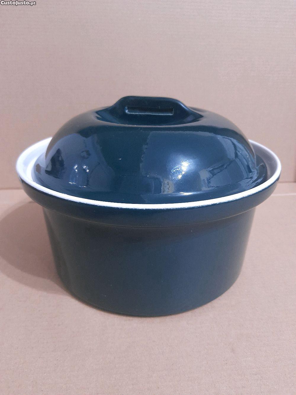 Caçarola de formato redondo fabricada em cerâmica. De cor verde escuro no exterior e cor branca no interior, tem 20 cm de diâmetro, medindo de altura até à borda 10 cm e 15 cm até à parte de cima da tampa no final da asa. Está nova, nunca foi usada. Barato para desocupar. Negociável, vendo pela melhor oferta. Possibilidade de entrega em mão.