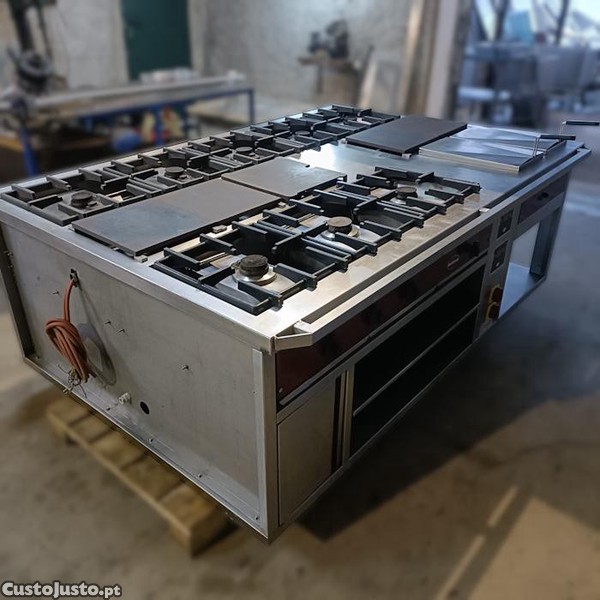 Fogão central Rubbens com 8 queimadores e fritadeira com 2 cubas