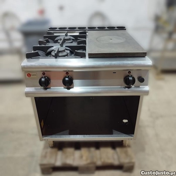 A2410- Fogão a gás Baron, com 2 queimadores + placa radiante, sobre base aberta.