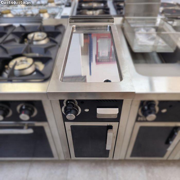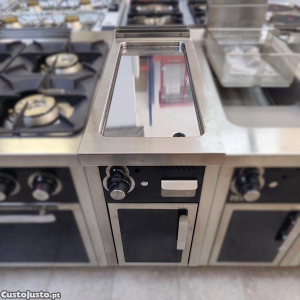 N661- Fry-top a gás de móvel FT9004ECR com chapa de 20mm espessura em cromoduro. Inclui apara salpicos e molheira de gaveta. Com acendimento automático e válvula termostática.