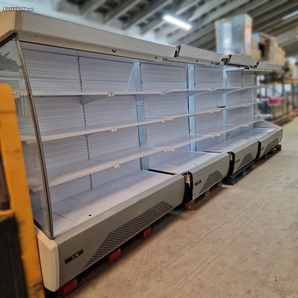 A2068A - Mural de lacticínios Vouga, com 3 prateleiras e fundo, composto por 4 módulos. (2×1900 + 2×1250). Com 2 motores à distância insonorizados, termostatos independentes, iluminação e cortina noturna.