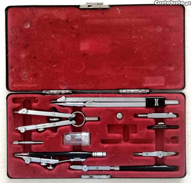 Caixa de compasso, marca de qualidade. Falta-lhe o compasso de bomba de lápis, e um dos tira-linhas, fotografado à parte, não é de origem, e mostra oxidação.