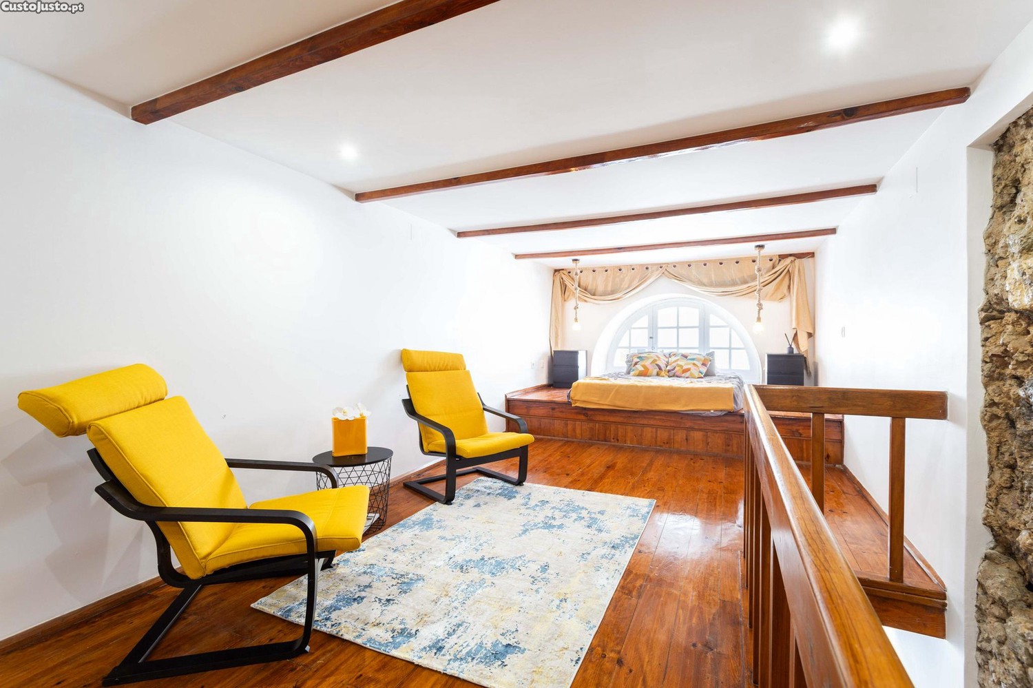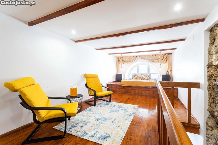Com uma área de 62m², este imóvel oferece um espaço social amplo, com cozinha equipada aberta para a sala e uma casa de banho. No piso superior, encontramos a zona privada da residência, composta por uma zona de estar e pela área do quarto de dormir. O chão em madeira e a janela redonda são elementos diferenciadores que conferem elegância ao ambiente. A disposição em duplex proporciona uma sensação única de privacidade e sofisticação, ideal para quem valoriza um lar diferente e exclusivo.