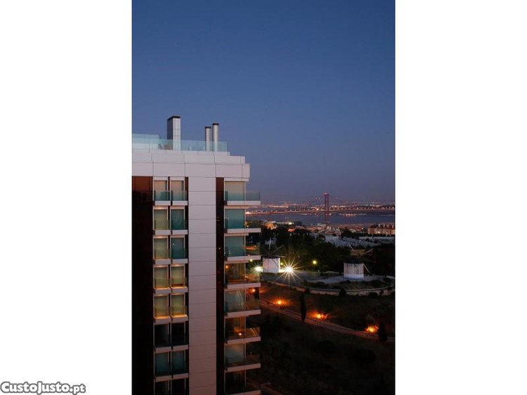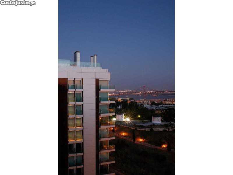 Restelo-Belém, T4 com 260 m2. Vista sobre o Tejo, novos a estrear, compostos de Terraço 28 m2. Hall 6 m2, sala 56 m2, suite 20 m2 com casa de banho 6 m2, suite 19 m2 com casa de banho 5 m2, closet 5 m2, quartos 15 m2 e 14 m2, casa de banho completa 5 m2, casa de banho social 4 m2, cozinha equipada 19 m2 com despensa 3 m2. Inserido no edifício no Restelo, situado em plena encosta do Alto do Restelo, hoje, uma das zonas nobres da cidade. O edifício, inovador, é equipado com duas piscinas, balneários, sauna romana, ginásio e com vista panorâmica das mais deslumbrantes da cidade. Três lugares de estacionamento.