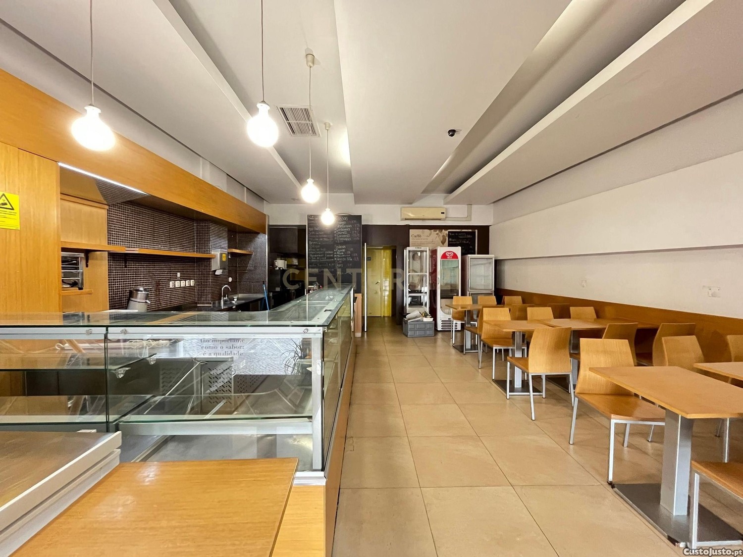 Esta loja tem uma área bruta de 80m2 e está preparada para estabelecimento de restauração e bebidas, tendo saída de fumos, copa, zona de confecção e pequena esplanada na galeria.