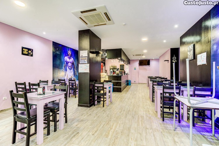 O espaço é comercializado com todo o equipamento: Vitrines, 3 arcas frigoríficas, 4 arcas, grelhador elétrico, micro-ondas, máquina de loiça, ar condicionado, mobiliário (mesas e cadeiras), musica ambiente e TV´s.