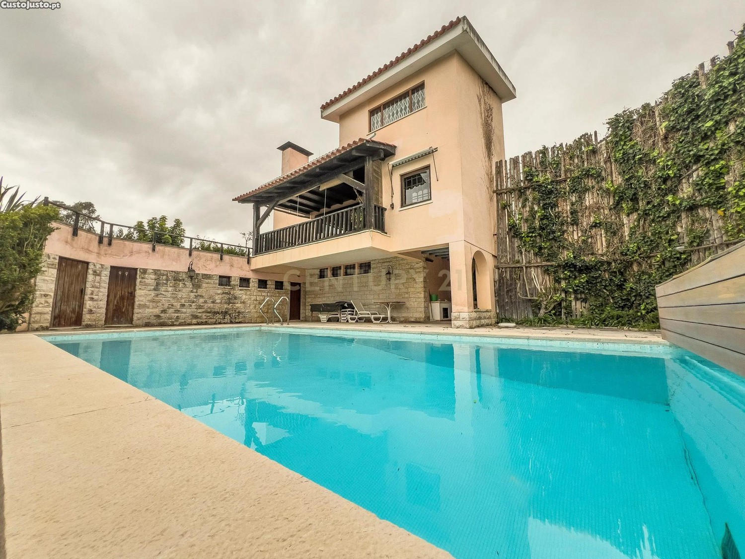 O exterior é um convite ao lazer, com uma piscina de grandes dimensões para os dias quentes, sauna e chuveiros fechados para puro relaxamento e uma varanda espaçosa onde cada fim de tarde se transforma num momento especial. Duas garagens amplas garantem comodidade e segurança.