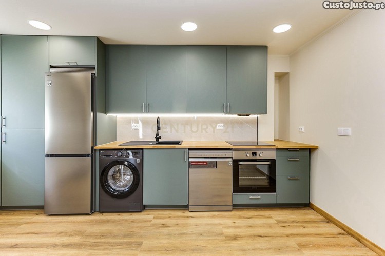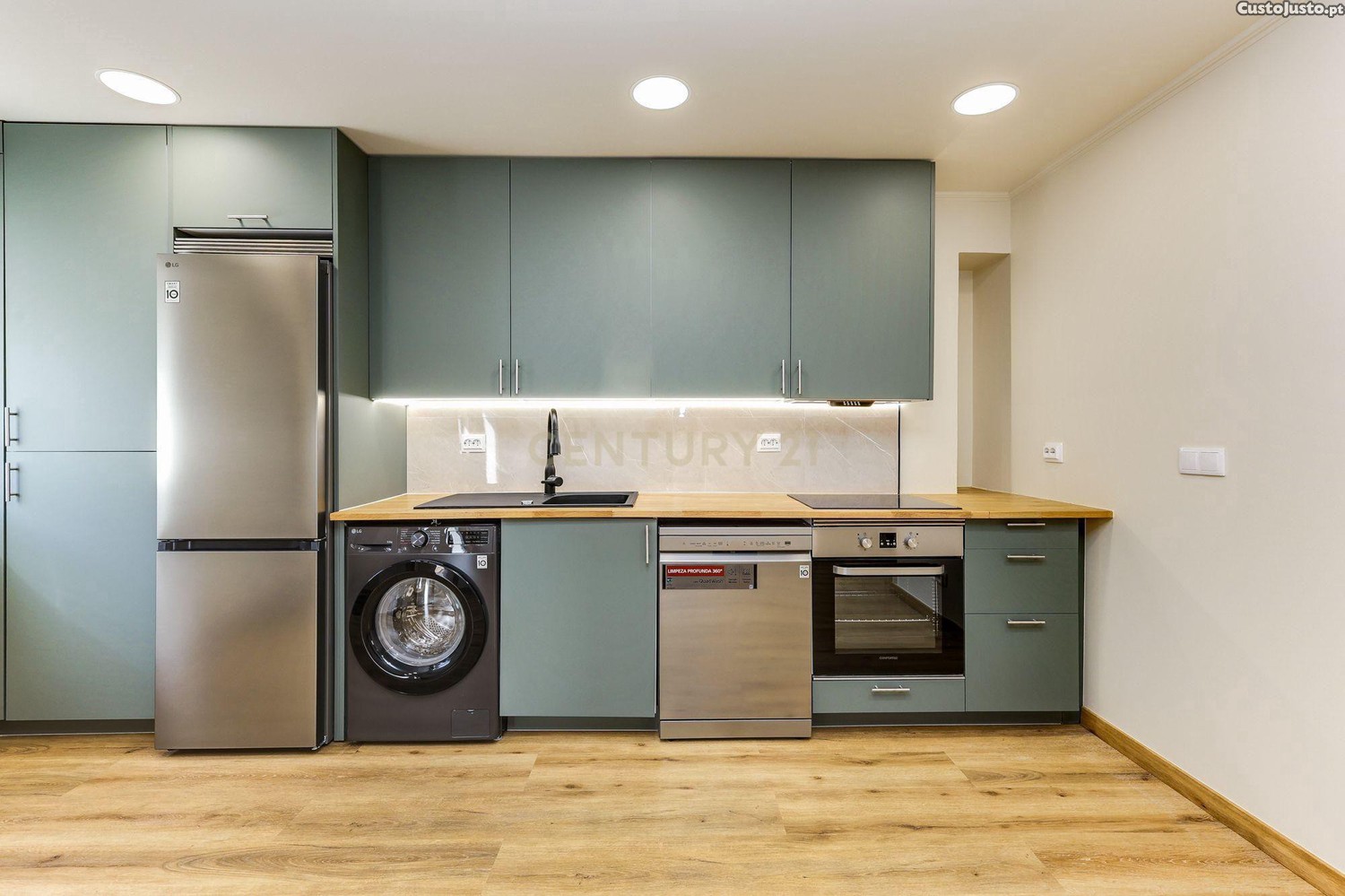 cozinha totalmente equipada (placa de indução, forno elétrico, exaustor, máquina de lavar loiça, frigorífico combinado, termoacumulador de 100L, máquina de lavar e secar roupa de 9Kg)