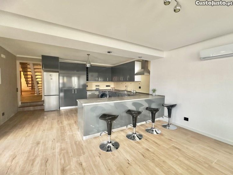 Com 180 m² de área bruta (119 m² úteis), a moradia distribui-se por dois pisos bem pensados para o dia a dia. No piso térreo, a ampla zona social integra sala luminosa e cozinha em estilo americano totalmente equipada, criando um ambiente moderno e fluido. Neste piso encontra-se também um quarto em suíte de 19 m², um segundo quarto de boa dimensão e uma casa de banho social de 4,3 m², já preparada para instalação de base de duche. No primeiro andar situa-se a suíte master com 45 m², casa de banho completa e acesso direto a um terraço coberto de 32 m², com vista desafogada para a Serra de Sintra e Cascais.