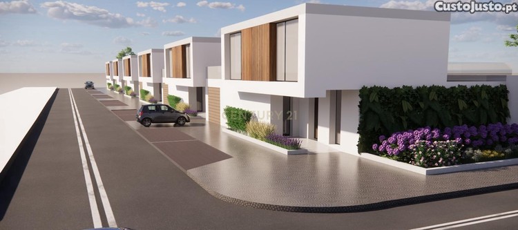Cada moradia tem garagem para dois carros, jardim e piscina privados.