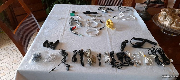 Vários cabos de som, de telemóveis, webcam para Pcs Logitech com gravação fotos e regulaçao de lente com dois botões de foto e vídeo com mola para Pc ou outros.Auriculares vários, adaptadores vários de carregamento para telemóveis, fichas de qualidade scart, ficha tripla scart marca Bandrige, adaptadores tv video, áudio, varios cabos usb, auriculares novos vários tipo Informática, eletrónica, audio, tv, acessórios telemoveis material novo e usado. Veja o que precisa e combinamos preço . Preço dous euros simbólico.