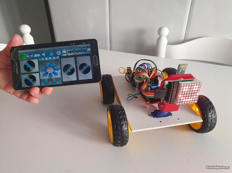 Carro Robot Educacional Arduino programado e programável, controlado por Bluetooth (APP-BLUETOOTH RC CONTROLLER). Carro inteligente programável com programação C++.Carro com display 8X8 indicando a direção da viatura.Este carro robot devia ser utilizado no Ensino Primário e Secundário para os alunos aprenderem a programar assim como os Adultos que se interessam por Programação C++ (Arduino.cc) e PHYTON. Oferta do programa C++.