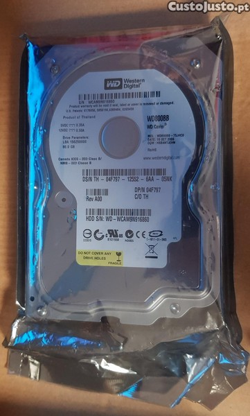 Preço: 20 €Disco interno de 80 Gb EIDE 3,5 Western Digital WD800BB Caviar (NOVO)
