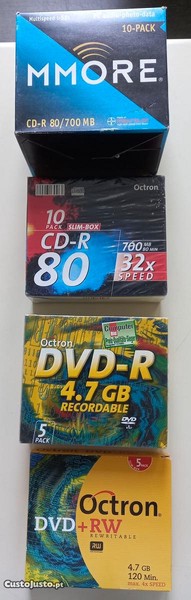 Packs CD-R (20) / DVD-R (5) / DVD-RW (5). Todos NOVOS e embalados. Entrego presencialmente. Pagamento em numerário. Preço fixo.
