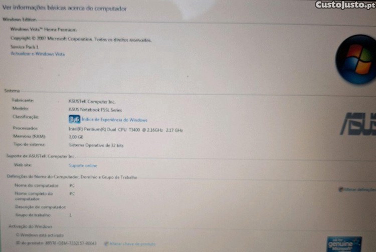 Computador portátil Asus modelo X59SL em bom estado de conservação. Ainda com o Windows Vista instalado.