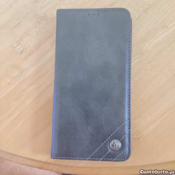 Capa (estojo) para OnePlus 7 Pro, Cinzento, Textura Retro, em cabedal frente e traseira, desdobrável, com berço fixador do telefone em plástico e com três bolsas para cartões multibanco.
