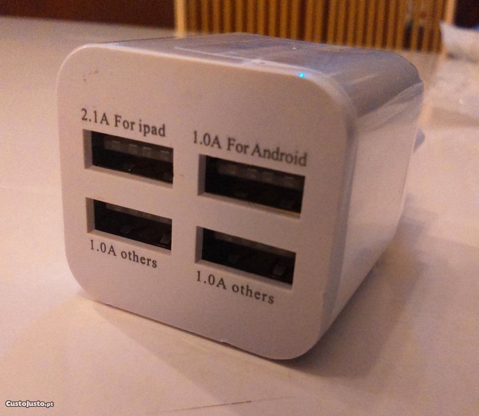 Carregador de casa com 4 portas USB, pode usar em simultâneo.