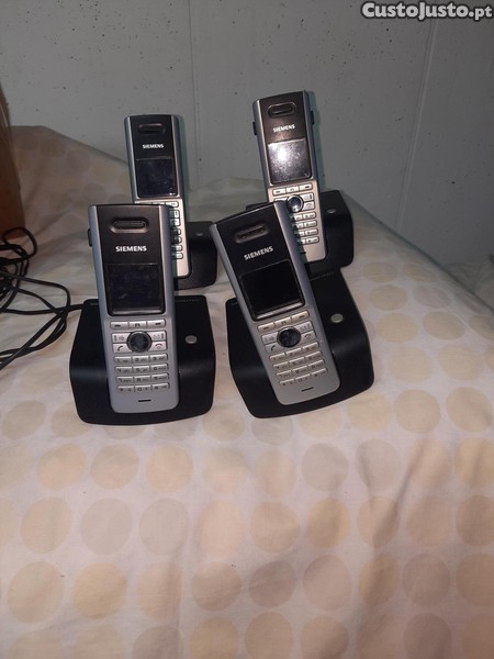 Conjunto de 4 telefones/intercomunicadores com um repetidor, todos da marca Siemens modelo Gigaset, a funcionarem em pleno.
