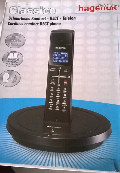 Telefone sem fios de tecnologia DECT/GAP, Hagenuk-classico. As suas reduzidas dimensões (140x35mm) tornam este telefone uma peça decorativa e permitem um conforto elevado quando segurado na mão. Possui um display matricial alfanumérico de 3 linhas para texto e mais uma para símbolos, com rectro-iluminação azul. Agenda para 50 registos de telefones. Escolha de 6 melodias de toque. Autonomia de 8h em conversação e 130h em standby. Função Baby mode. Funciona com 2 baterias tipo 2/3 AAA NiMH de 1,2V 400mAh. Fornecido em caixa original, em estado novo.