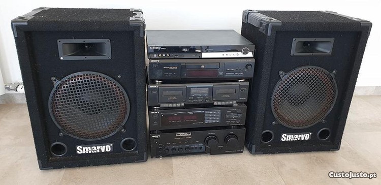 Vendo esta aparelhagem de marca Sony, juntamente com um gravador de DVD da marca Samsung.Dimensao das colunas 63 x 45 x 34cm
