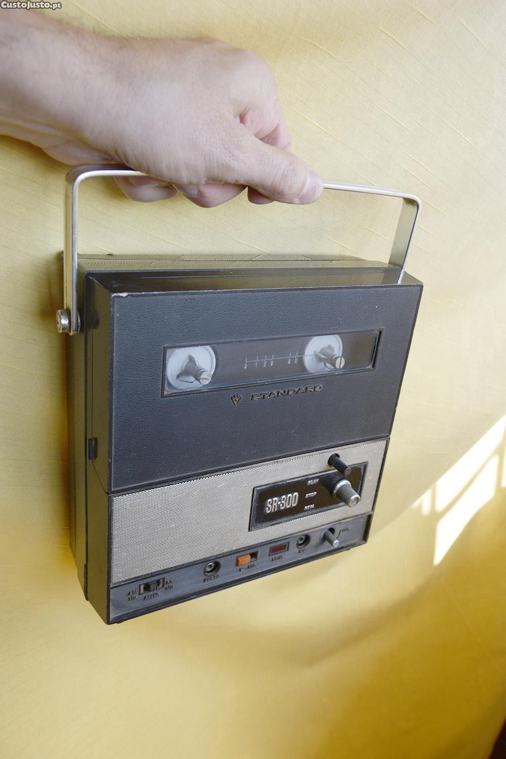 Gravador de fitas magnéticas antigo. Desconheço o estado de funcionamento. Tem entrada para cabo de alimentação com uma ficha mais pequeno que o habitual e não disponho do cabo nem fitas dessas. Ideal para decoração ou para quem tenha um cabos desses. Tambem tem compartimento para pilhas grandes. Medidas 20x20cm. Não respondo a sms.