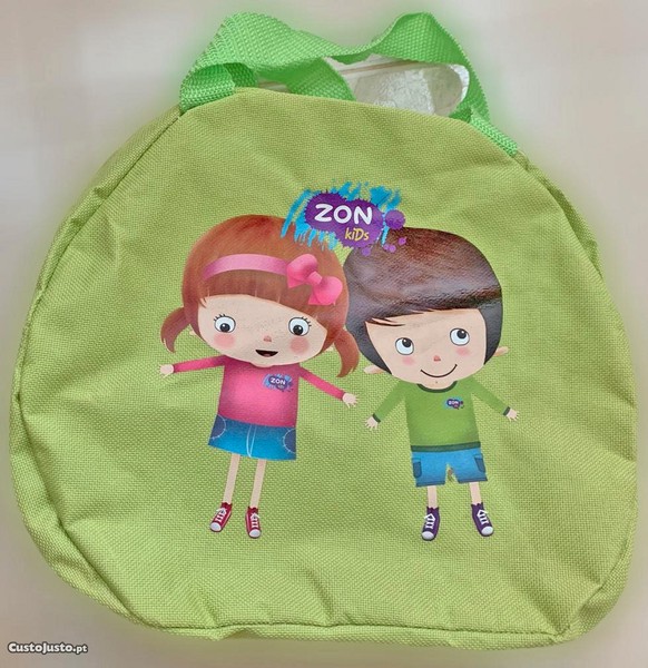 São da Zon Kids. São de cor base verde claro e na frente possui a identificação da marca e os personagens que a representam. A lancheira tem a identificação na parte de trás também, possui duas alças, facilitando o seu transporte e fecha com fecho éclair da mesma cor. O cantil é em plástico, leve e fácil de transportar, com tampa de rosca. É um conjunto muito cómodo e extremamente útil.