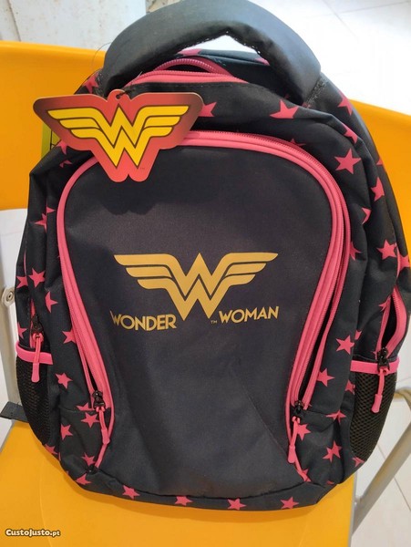 Mochila Mulher Maravilha com etiqueta.