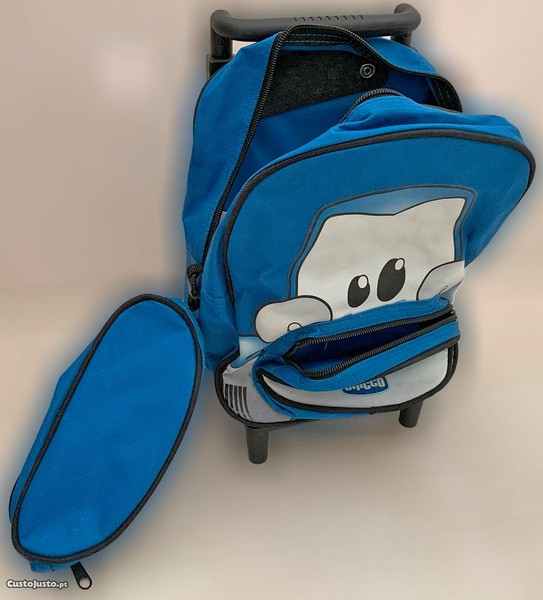 De grande qualidade, é da reconhecida marca Chicco. É de cor base azul médio e possui, na frente, o rosto de um personagem, um carro com olhos, em que a bolsa exterior extra representa a zona da frente desse personagem, com os faróis e a identificação da própria marca. Além dessa bolsa extra na frente, que fecha com fecho éclair, possui ainda um estojo e condizer, da mesma cor e com o mesmo personagem, que também fecha com fecho éclair. As alças são ajustáveis, para permitir uma correcta postura. Tem uma pega no topo para que se possa elevar-se com mais facilidade e pendurar-se. É muito cómoda e útil e as crianças adoram o personagem. Possui um troley, de corr preto, com altura regulável e com rodas e travão para levar a mochila de forma fácil, não precisando carrega-la às costas. O troley é muito robusto e a mochila tem uma excelente estrutura. É muito versátil, cómoda e de uma enorme utilidade, ideal para o pré-escolar, actividades ou para passeio.