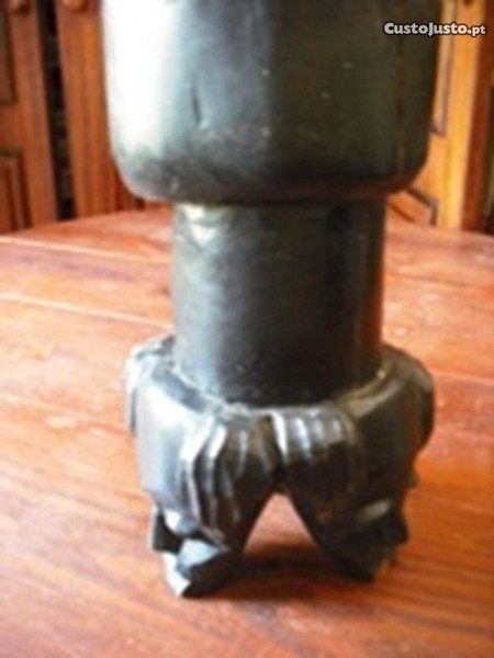 Peça única,talhada em madeira escura : base com 3 pés em forma de cabeça humana