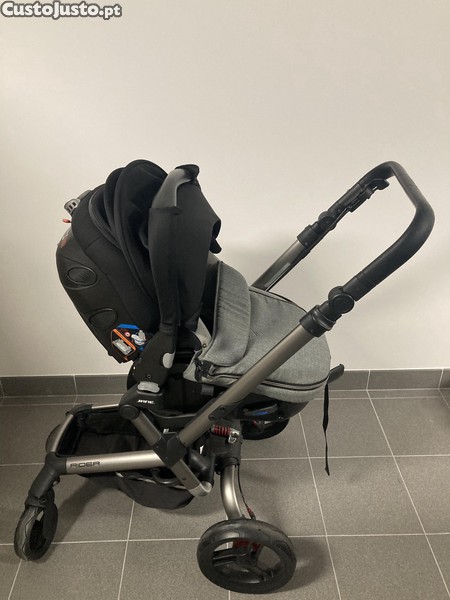 Carrinho de bebé Jané, modelo Rider + Matrix Light 2, cor cinzento, em excelente estado e completamente funcional. Preço apresentado é menos de metade de um carrinho novo.