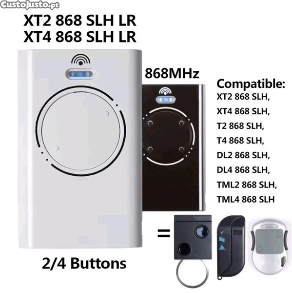 Comando de porta de garagem modelo XT2/XT4 SLH LR, compatível com diversos modelos de controlo remoto de portas de garagem. Ideal para substituir ou complementar o seu comando existente.