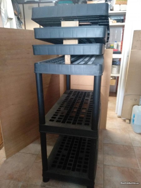 Vendo estante em plástico reforçado com seis parteleiras, com medidas de (1,10 × 45,0 m) Altura entre parteleiras (30,0m) com pouco uso, não tenho utilidade, e também para desocupar.45