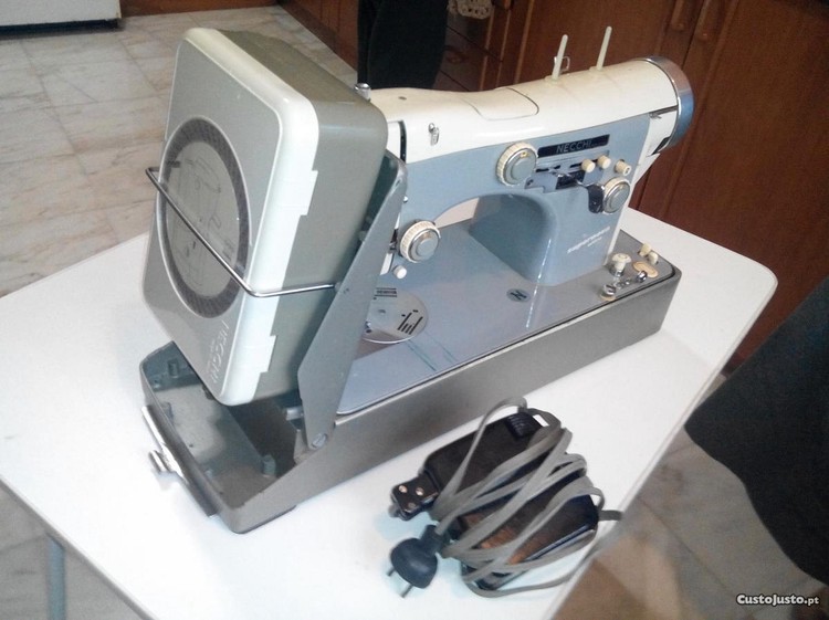 Máquina de costura Necchi impecável com caixa de origem, acessórios e descrição dos pontos executados