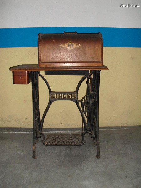 Máquina de costura antiga "Singer" perfeitamente operacional. A madeira do móvel necessita de tratamento.