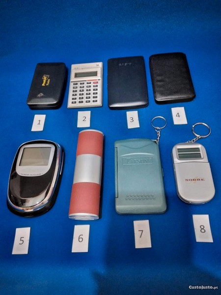 8 mini calculadoras vintage, em vários formatos e tamanhos