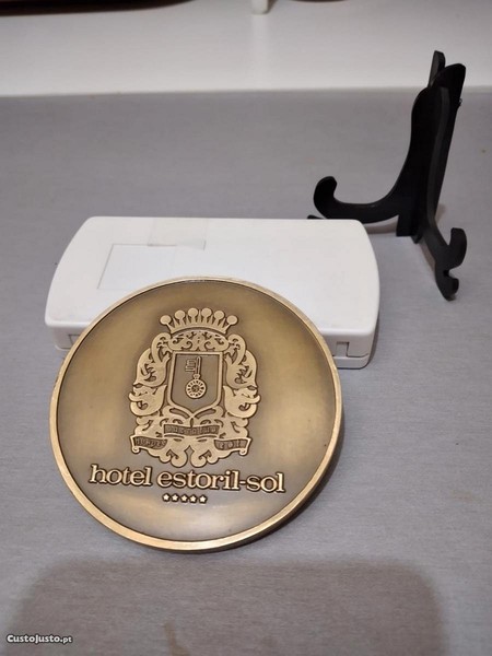 Placa de bronze, aluzíva ao extinto Hotel Estoril Sol, com 7cm de diâmetro mais o suporte.