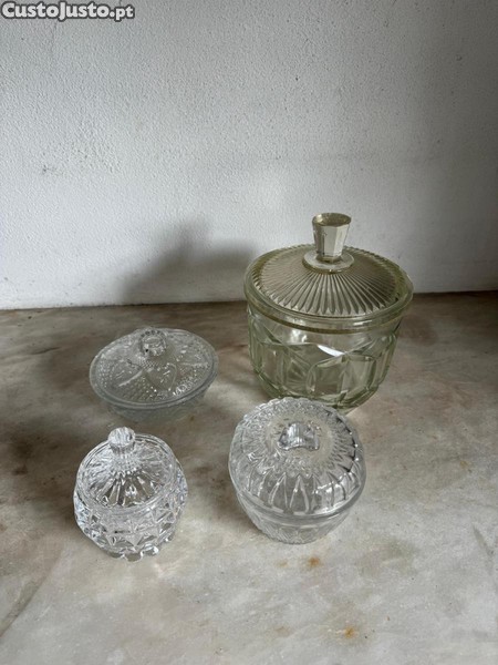conjunto composto por 1 pote de vidro trabalhado com tampa + 3 potes mais pequenos preço á unidade pote grande 12EUR cada pote pequeno 8EUR