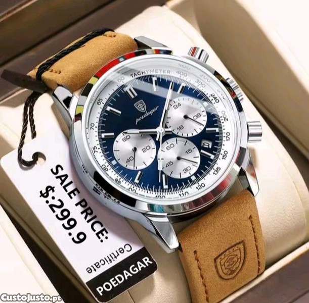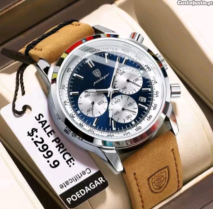 Relógio novo de marca original Poedagar, á prova de água e cronógrafo com calendário, com pulseira de pele genuína com logótipo da marca, em caixa da marca Poedagar, pano de limpeza e cartão de garantia Poedagar. 1 ano de garantia de fábrica.