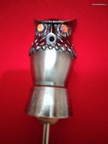 Rolha em inox , cabeça de mocho , com os olhos em brilhantes tricolor, com 9 cm. de altura