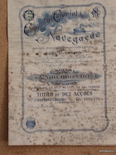 Preço: 15 €Título de 10 acções de 1922 - Cª. Colonial de Nave