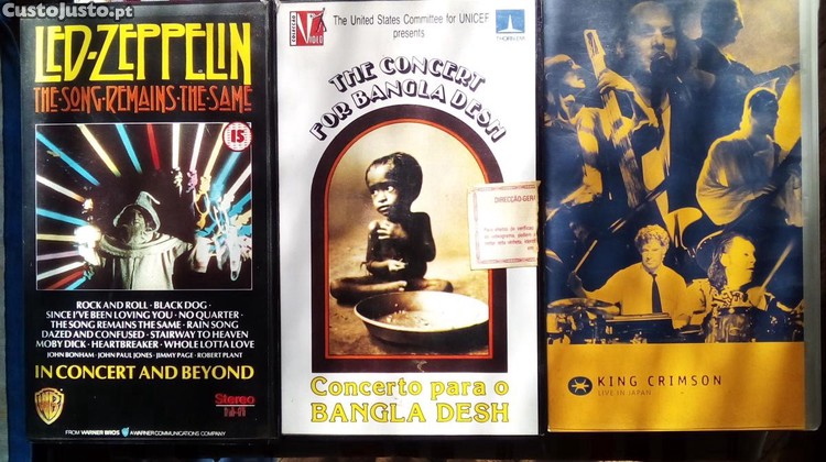 Três cassetes VHS, com concertos ao vivo originais; último concerto dos led zeppelin, concerto dos King krimpson e por último concerto para Bangladesh.