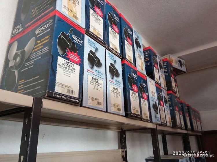 Vendo lote de hélices em alumínio e inox com desconto brutal, -70%, - 80%, -90% em relação ao PVP. São 65 hélices ao preço médio de 30 euros por unidade, total 1950 euros. Passo factura da venda. São todas novas, sem uso. Servem para Honda, Yamaha, Suzuki, Tohatsu, Evinrude, Johnson, Mercury, Mariner, Mercruiser, Volvo Penta SX. Se quiser comprar só uma ou duas unidades, posso vender também, com preço unitários de 90-300 euros dependendo da hélice. Diga o que precisa que logo indico o preço. Nota: já não tenho nenhuma para Merc/Mariner 40-60cv. Podem ser levantado perto da Venda do Pinheiro.