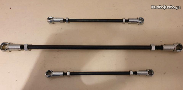 Vendo conjunto de tirantes de actuação da caixa de velocidades reforçados tipo Group N para Citroen Saxo/AX ou Peugeot 106. Material novo, nunca foi usado. De qualidade e execução muito superior superior face aos vendidos por aqui. Não é material dos chineses. O veio é feito de uma peça maciça e não de varão roscado revestido por um plástico.