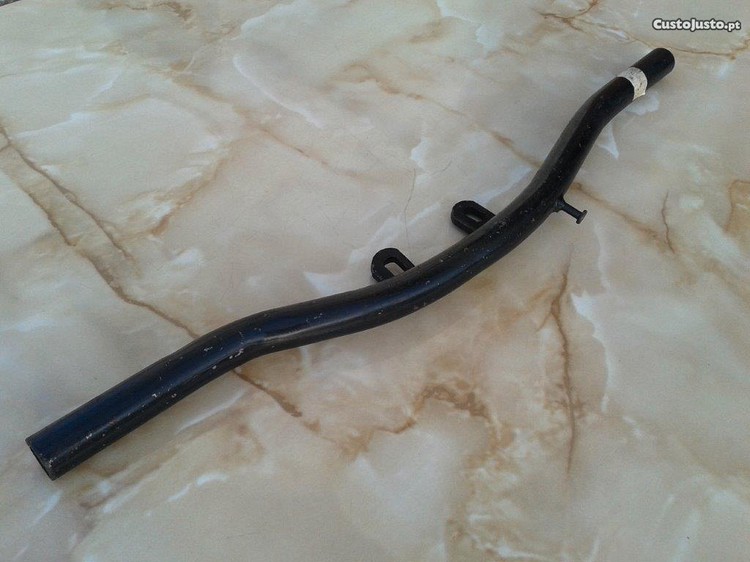 Varão / barra / ferro / travessa / estribo pousa / pisa pés da frente / dianteiro / do condutor / primeiro passageiro
