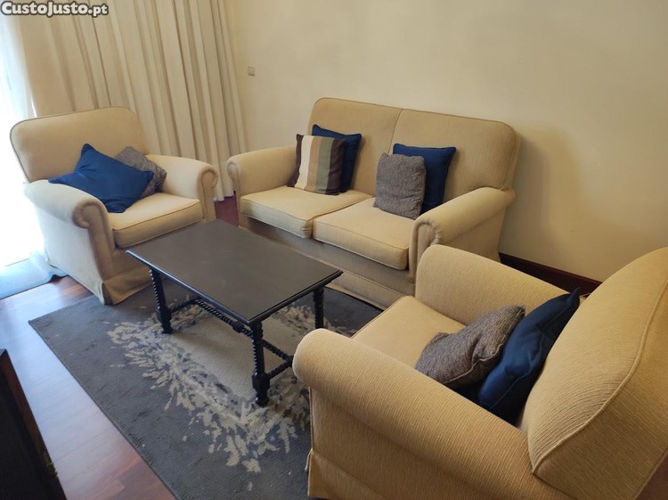Estofado em tecido bege, em muito bom estado (sem cheiros a fumos, pelos de animais, ...) e confortável